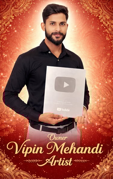 "Vipin Mehandi Artist, the creative force behind the brand, brings over 15 years of rich experience in the art of mehndi design. Known for his precision, creativity, and modern bridal styles, Vipin has built a strong reputation in the industry. His talent has also gained massive recognition on YouTube, where he proudly holds a Silver Play Button and has grown a community of 200K+ subscribers who admire his unique designs. One of his top mehndi videos has crossed an impressive 20 million+ views, showcasing his expertise and popularity among mehndi lovers. With a passion for perfection and customer satisfaction, Vipin continues to deliver elegant and trend-setting mehndi designs for every occasion"