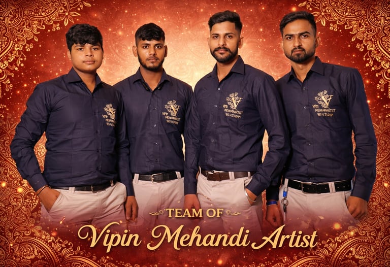 The Team of Vipin Mehandi Artist is a group of highly skilled and dedicated professionals who bring creativity, precision, and passion to every design. Trained under expert guidance and backed by years of hands-on experience, the team specializes in bridal, Arabic, and modern mehndi styles that perfectly match today’s trends. Known for their friendly approach and timely service, they ensure every client feels comfortable and satisfied on their special occasion. With a strong commitment to quality and attention to detail, the team works seamlessly to deliver flawless mehndi designs that enhance the beauty of every celebration.